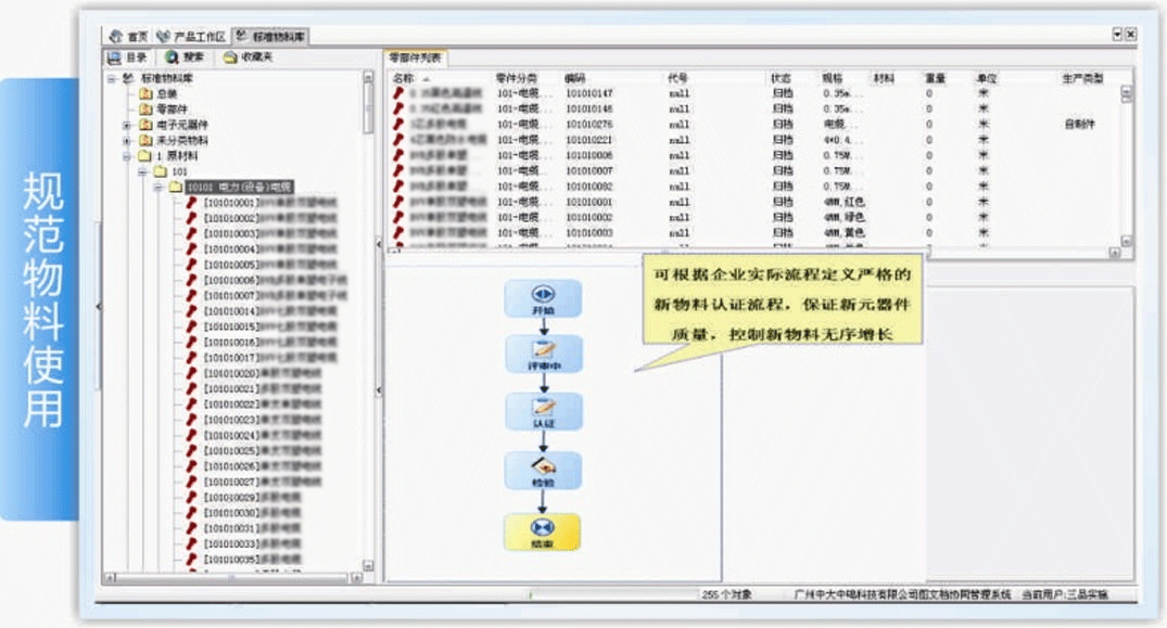 中大中鳴在實施三品PLM前,沒有統一的、規范的物料信息可以讓設計師放心查閱和準確使用。三品PLM中采用了標準物料庫模塊和相應的技術手段,在產品開發期間,設計師就能介入到新物料的定義、審批、申購等環節,將物料增長無序、產生大量冗余物料、物料有效性不清、編碼前后不一的現象徹底消滅在新產品的設計研發階段。