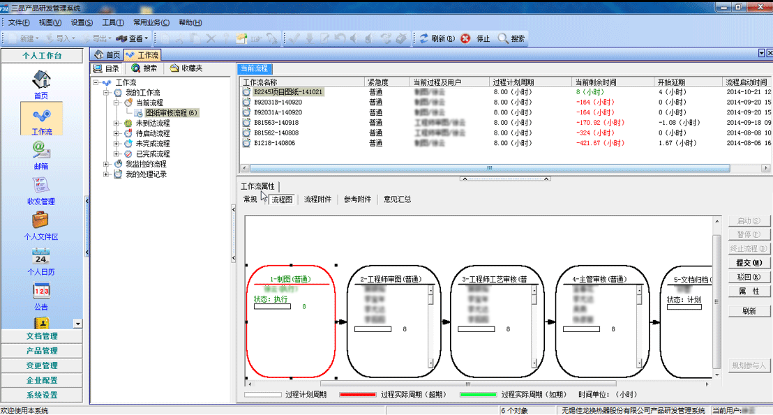 通過三品PDM平臺,在實施初期,三品實施顧問結合佳龍換熱器實際現狀,整理、總結、優化了符合佳龍換熱器業務流程的五大主要業務流程。實現從市場部接單、技術主管確認訂單、一直到圖紙設計、審核、校對、批準、變更等整個生命周期的流程控制。大大減低了之前部門之間,員工與員工之間扯皮推諉的現象,同時通過不同業務流程的統計功能,對眾多的管理決策起到了一定的數據支撐。