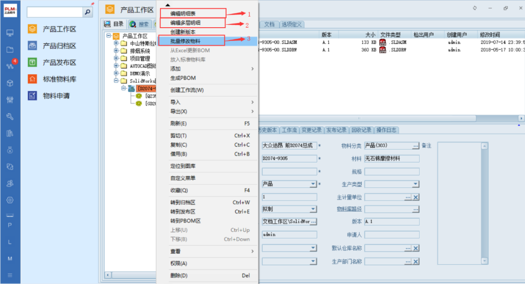 三品PDM系統可以分類管理企業的標準件、通用件、零部件、元器件庫及相關成品、半成品、原材料等物料庫,做好新物料的承認管理工作,方便快速查找引用、促進企業物料管理的標準化、提高企業基于物料的模塊化組件化設計水平。