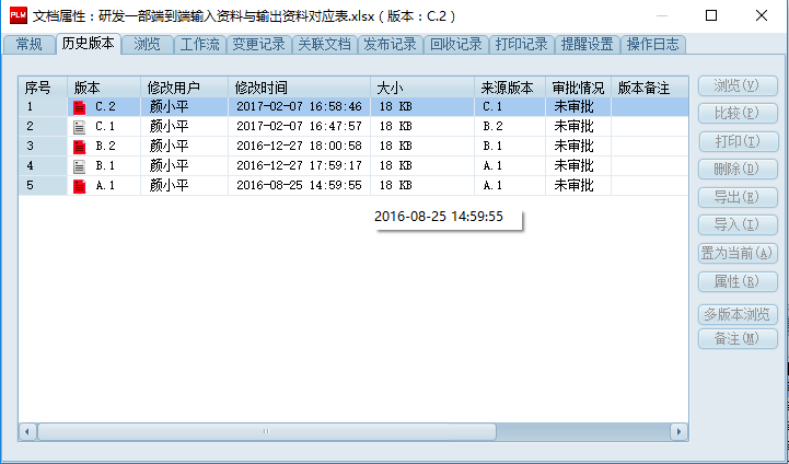 3、各類文檔均可能單獨查詢歷史版本、變更記錄、打印記錄、回收記錄、執(zhí)行的流程以及詳細(xì)的操作日志,便于追溯文件的各類活動軌跡。