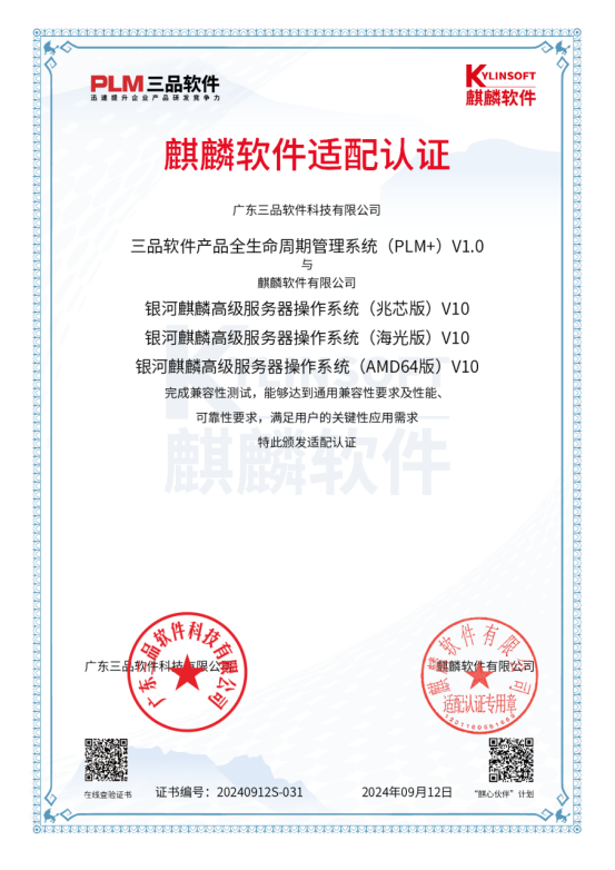近日,三品軟件產品全生命周期管理系統(PLM+)V1.0與麒麟軟件成功完成了兼容性適配認證,這標志著我司在推進國產化創新發展進程中取得實質性的進展。
