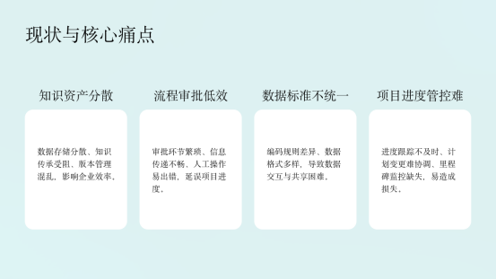 流程審批效率低下:從設(shè)計(jì)評審、圖紙發(fā)放到變更執(zhí)行,多數(shù)環(huán)節(jié)仍依靠紙質(zhì)單據(jù)與線下溝通,流程周期長、節(jié)點(diǎn)不透明、追溯困難。尤其在多部門協(xié)同項(xiàng)目中,信息傳遞延遲與誤差直接影響項(xiàng)目進(jìn)度與交付質(zhì)量。