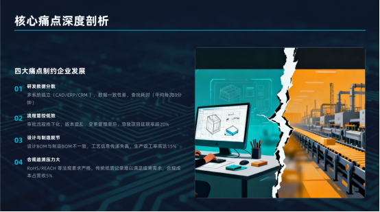 核心要點:電子制造業普遍面臨研發管理粗放、數據孤島、變更頻繁、合規嚴苛等挑戰,在深圳快節奏、高競爭環境下,這些痛點直接轉化為訂單交付延遲與成本失控。