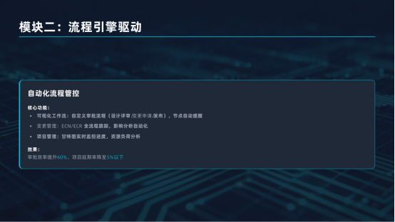 ○具體內容:提供從基礎數據管理到高級項目協同的模塊化、可擴展的解決方案,支持分階段投入。針對中小型電子制造企業,有經過驗證的輕量化快速部署方案,控制初期成本,快速見效。