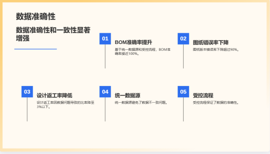 3.數據準確性與一致性增強:基于統一數據源和受控流程,BOM準確率接近100%,圖紙版本錯誤率下降超過90%。設計返工率因數據問題導致的比率從平均12%降至3%以下。