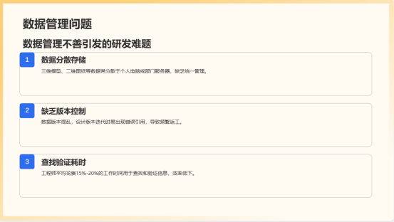 1.數據管理碎片化與版本混亂:研發過程產生大量三維模型、二維圖紙、技術文檔、仿真數據及BOM物料清單。這些數據常分散于個人計算機或部門服務器,缺乏統一、安全、版本受控的中央庫管理。設計版本迭代時易出現錯誤引用,導致返工。據行業數據,工程師平均花費15%-20%的工作時間用于查找和驗證信息。