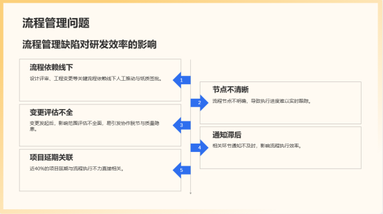 2.流程非標準化與執行不透明:設計評審、工程變更、項目審批等關鍵流程依賴線下人工推動與紙質簽批,流程節點不清晰,執行進度難以實時跟蹤。變更發起后,影響范圍評估不全,相關環節通知滯后,易引發協作脫節與質量隱患。調研指出,近40%的項目延期與流程執行不力直接相關。